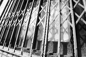位于地铁10号线北土城站附近的水立方门票临时销售点的窗户护栏紧锁。昨日(14)上午,不多的水立方门票向散客销售,买票者发生争执。记者王申/摄