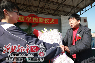3月9日上午,唐海县第二中学收到了爱心人士王国平先生捐资助学的50万元现金,这笔专款将用于唐海二中的图书馆建设。据悉,王国平先生是一位农民企业家,多次捐资助学,为灾区捐款,并于2008年自己出资60余万元在唐海翻修了一条3公里长的公路,后被人称为“国平路”。目前,已经累计用于慈善事业捐款百余万元。“希望我的捐款行为能够带动更多的好心人,一同关注我们的学生,关注我们的学校,关注我们的社会。”王国平先生说。