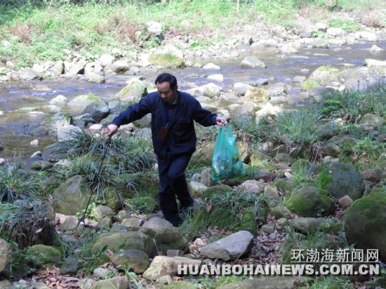 环渤海新闻网消息 在建党90周年前夕,唐海县组织全县宣传干部开展了“红色旅游、踏寻伟人故乡”活动。当他们到达被誉为“红军寨”的湖南黄寨沟时,开展了一小时“红色旅游环保踏青”活动,捡拾黄寨沟河边的垃圾,并送到指定地点。图为县环保局干部杨占山正在捡拾垃圾。 郑永春 杨文海 摄