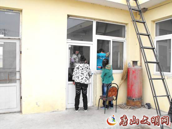 三农场小学生为敬老院擦玻璃