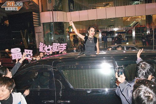 七人车停在楼下等候容祖儿时,突遭大砖空袭击毁车顶。