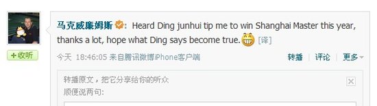 此前,腾讯体育对首轮出局的丁俊晖进行了专访,中国“一哥”在访谈中说过“马克威廉姆斯夺冠可能性大一些,感觉他的状态上佳。”而当赛后了解到这一情况后,“金左手”也在微博中对于丁俊晖的“看好”表示了惊喜:“Heard Ding junhui tip me to win Shanghai Master this year, thanks a lot, hope what Ding says become true. (听说丁俊晖预测我将在今年上海大师赛夺冠,非常感谢,希望丁俊晖的预测成真!)”