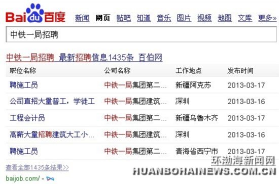 环渤海新闻网消息 (记者 白硕)3月18日,网友张先生给本网打来热线电话,称其在网上看到中铁一局集团第二工程有限公司大量发布招聘信息,他通过电话与该信息负责人取得联系,认为该招聘信息有虚假嫌疑,希望通过媒体呼吁广大应聘者不要上当受骗。