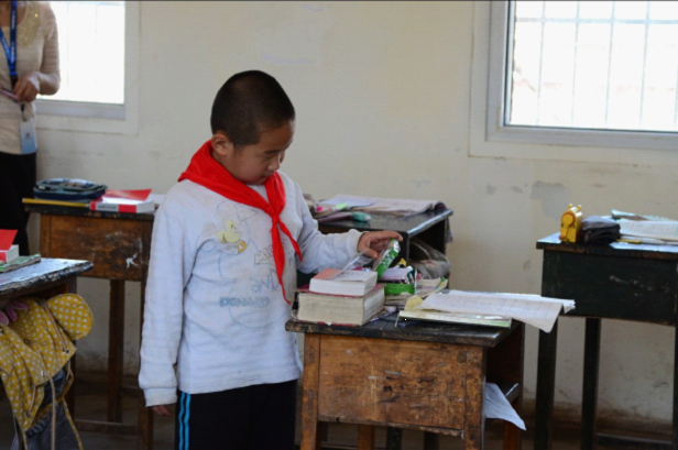苍官营小学的教室是一间间普通平房,教室面积很小,也不过摆放30张桌椅,老式的黑板上写着计算公式,显然,这是孩子们上课痕迹。早已坑洼破旧的课桌上摆放着孩子的书本和铅笔盒,整洁的本子上有孩子们写的作业。城市的孩子很好奇地拿起一块小小的、旧旧的橡皮:“这块橡皮这么小,都用不了一个月啊!”“是啊,这里小朋友的东西比你的差多了吧?可是他们都努力地学习,所以,你也要好好学习,知道吗?”面对孩子的提问,一位家长借机教育孩子要珍惜自己的生活,好好努力。在大家参观学生的课桌上书本、作业的空档,我留意到讲台上的桌子,那是一个由破旧的长课桌改造成的讲台桌,或许是桌子泰国破旧了,被老师用白色的纸将桌面包裹了起来,上边放着粉笔盒、教学课本、现代汉语词典、老式的圆珠笔插在粉笔盒里,一个早已磨破了边儿的橙色女士挎包摆在桌子的一旁,这就是苍官营小学老师的讲台桌。而在教室的另一角,一个普通的课桌靠墙摆放,课桌上摆着一个小小的书架,书架上摆着的是十来本课外读物,原来这就是孩子们的读书角,这是我见过的最简陋的读书角了。由于校园太小,基本没有什么娱乐设施,在一个小院里,我们勉强看到了一些颜色鲜艳的滑梯、跷跷板之类,再仔细一看,院门上方写着幼儿园,这些东西是给幼儿园小朋友玩的!站在校园向北望,目光略过低矮的院墙,远处的高高矮矮的山没有一丝绿色,就这么光秃秃地成为这平地上的景色。