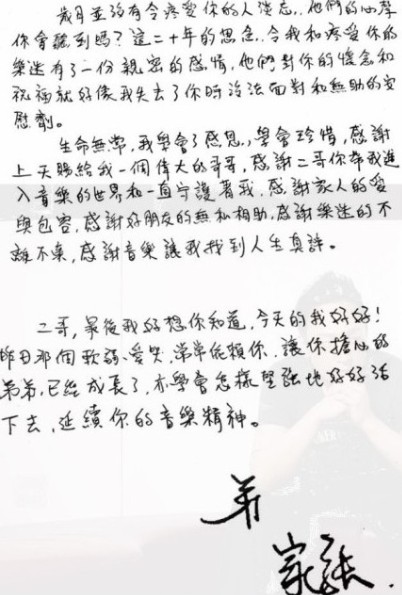 黄家强写信怀念黄家驹:对不起 没守护好Beyond