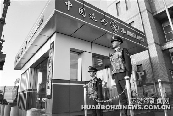 10月17日,曹妃甸港区新增码头泊位对外开放验收会在曹妃甸工业区举行。此次验收后,曹妃甸港区将新增3个码头8个对外开放泊位。截至目前,曹妃甸港区正式对外开放泊位已达28个,这标志着曹妃甸港正在向大型钻石级综合性国际深水大港迈进,对推动京津冀一体化快速发展具有重大战略意义。图为曹妃甸边防检查站官兵在新对外开放的曹妃甸港散货码头卡口执勤。