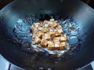 7.放入豆腐小火慢慢翻炒一会。